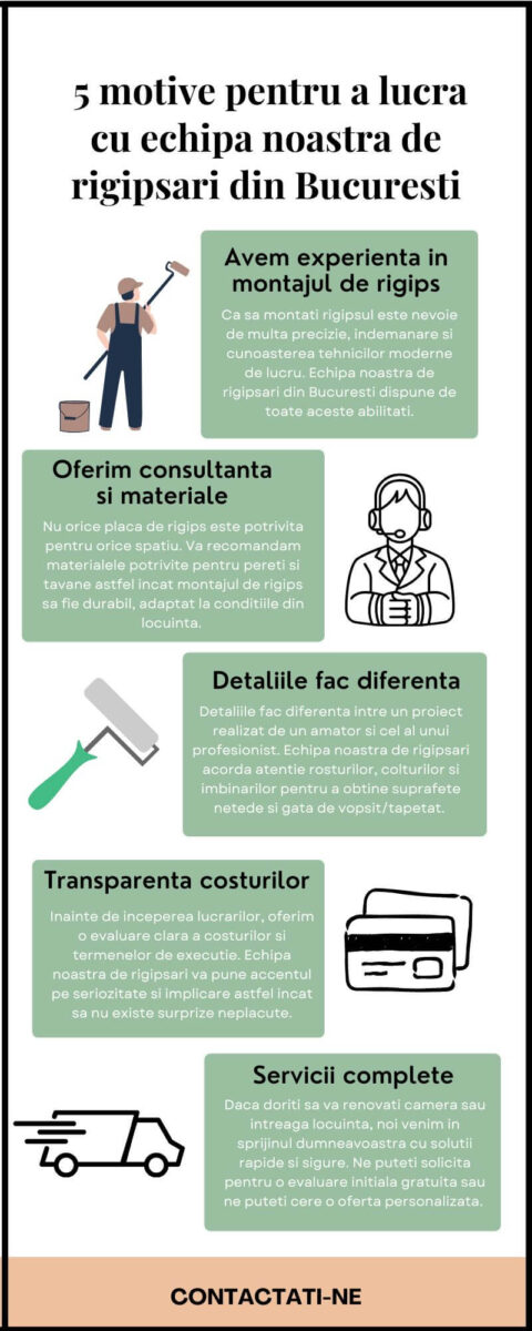 Echipa noastra de rigipsari din Bucuresti va poate ajuta cu finisajele si proiectele pe baza de rigips, asa ca nu ezitati sa stati de vorba cu noi si sa aflati detalii complete despre servicii si preturi.